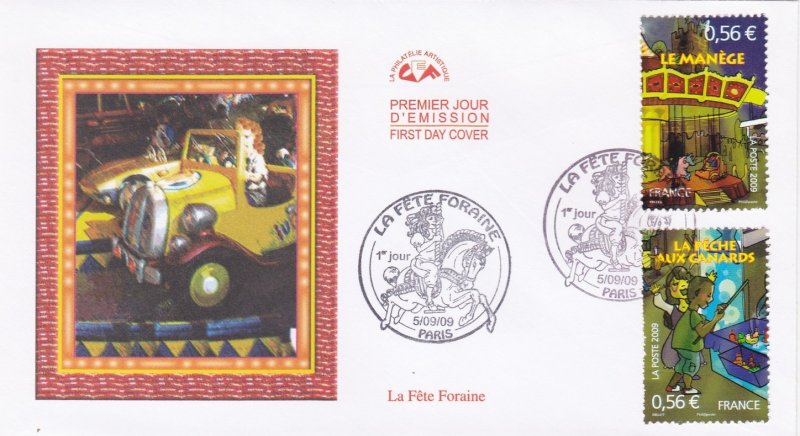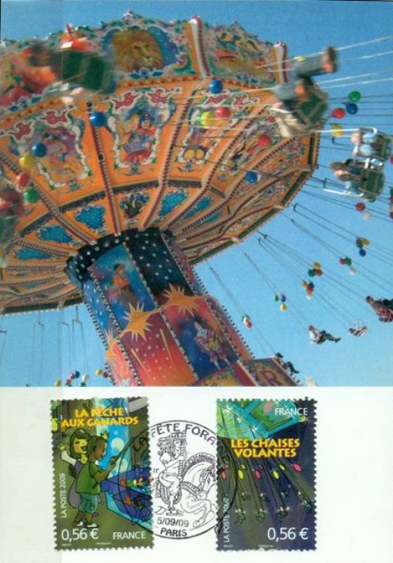 | Commentaire | La manifestation premier jour a lieu les 5 et 6 septembre à la foire aux manèges de Lille et le 5 septembre au Jardin d'acclimatation de Paris. Millet crée deux timbres à date spéciaux qui reprend le train « chenille » des montagnes russes du timbre pour Lille. À Paris, le sujet est une jeune fille chevauchant un cheval de manège |