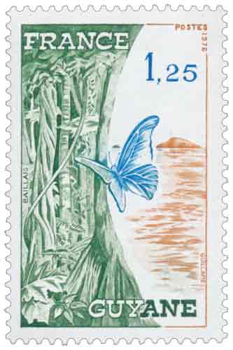 | Commentaire | Visuel : la forêt guyanaise avec un papillon "Morpho" et en arrière-plan les îles du Salut. D'un côté, le sol de latérite, teinte de rouille les eaux du fleuve. De l'autre, palétuviers, bougainvilliers, arbres à racines palmettes se surchargent de parasites. Au centre, le morpho, qui s'envole dans un éclat bleu électrique, évoque ce "paradis des insectes et des oiseaux". La Guyane, ancienne colonie devenue en 1946 département français, est située à 9000 km de la métropole.