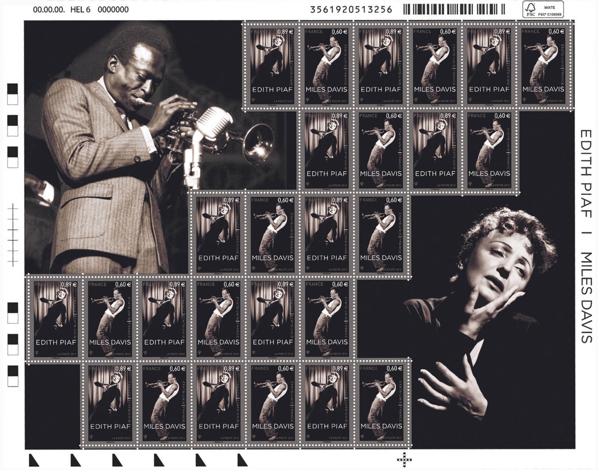 | Commentaire | Timbre à date “Premier Jour” conçu par Valérie Besser. Émis lors du salon du timbre 2012 En 2012, l'émission commune avec les USA rend hommage à Édith Piaf et Miles Davis, 2 figures de renommée mondiale qui ont triomphé en France et aux États-Unis. Pour les Américains, Piaf est le symbole de la France et de Paris. Pour Miles Davis, la France fut une révélation, un pays qu'il trouva moins raciste que les États-Unis et où il eut la sensation “d'être traité comme un être humain”. Les diptyques indivisibles présentés en feuille de 25 sont positionnés en damier. Ils seront également émis en feuille indivisible de 13 diptyques. |