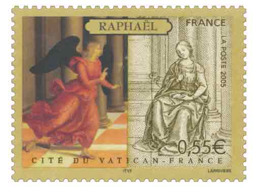 | Commentaire | En 2005 a été inscrite une émission commune avec la Cité du Vatican, sur le thème d’un grand artiste commun au musée du Vatican et au musée du Louvre. Cette émission se présente sous la forme d’un bloc incluant 2 timbres. En fond de bloc : l’œuvre peinte « l’Annonciation » de Raphaël, conservée au musée du Vatican et le dessin préparatoire conservé au musée du Louvre. Les 2 timbres différents reproduisent des détails de l’œuvre, sous ses 2 formes. « L’Annonciation » est un des épisodes du « Couronnement de la Vierge » peinte pour la prédelle du retable Oddi vers 1502-1504.Émission commune France-Vatican. |