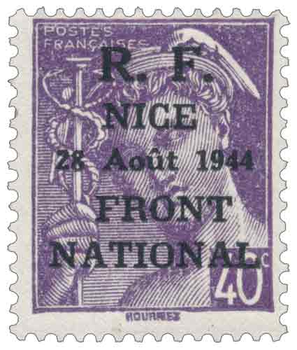 | Description | Type Mercure, surcharge R.F. surchargé R.F. NICE 28 août 1944 FRONT NATIONAL |