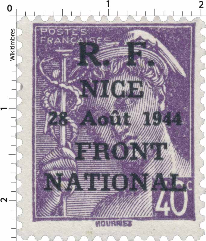 | Description | Type Mercure, surcharge R.F. surchargé R.F. NICE 28 août 1944 FRONT NATIONAL |