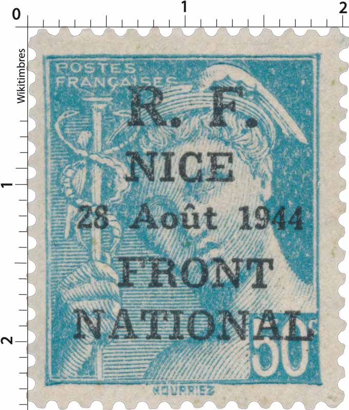 | Description | Type Mercure, surcharge R.F. surchargé R.F. NICE 28 août 1944 FRONT NATIONAL |