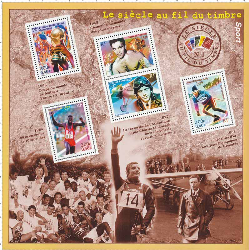 Timbre : Le siècle au fil du timbre Sport Mesures Format d'imp - Dents incluses 185 x 185 mm Forme carré Phosphore Non Impression héliogravure Complément xxxxx Couleur polychrome Valeur 3 F (0.46€) Dentelure - Emis en bloc-feuillet de 5 TP Quantité 5 900 000 Auteurs Dessinateur Claude Andréotto Graveur xxxxx Mise en page xxxxx Mentions D'après © AFP, © Collection Viollet. Avion : © Lapad Viollet © Agence Vandystadt /M.Hewitt - Allsport. R.Martin © Agence Temps Sport / G.Iundt Numéros & Dates N° Philatelix - N° Michel 3455 K Date d'émission 17/04/2000 Date de retrait 12/12/2003 Classements Groupe Le siècle au fil du timbre - Sport 2000 Catégorie Blocs et Feuillets Familles sport et loisirs personnages Usage lettres simples Régions - Départements - Description Le siècle au fil du timbre (I). Le Sport Commentaire - Mes timbres & notes personnelles www.wikitimbres.fr