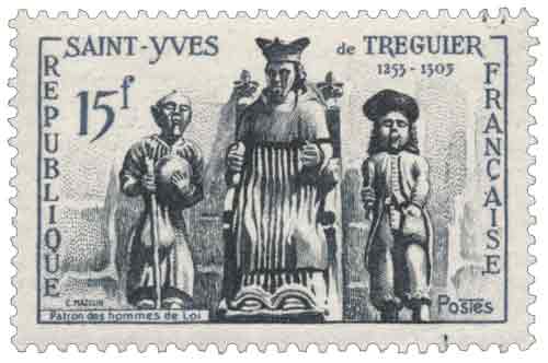 | Commentaire | Ce timbre-poste français émis en 1956 rend hommage à Saint Yves de Tréguier, figure emblématique de la Bretagne médiévale et patron des gens de loi, à l’occasion d’une émission commémorative associant mémoire religieuse, tradition régionale et usage postal courant. Dessiné et gravé en taille-douce par Charles Mazelin, le timbre adopte un format horizontal mettant en valeur une iconographie directement inspirée du célèbre groupe sculpté de la cathédrale de Tréguier, représentant saint Yves entre le Riche et le Pauvre, synthèse visuelle de sa vocation de juge équitable et de défenseur des humbles. Né au XIIIᵉ siècle dans une famille noble mais modeste, Yves Hélory mena des études de théologie et de droit à Paris et à Orléans avant d’exercer des fonctions judiciaires ecclésiastiques en Bretagne, où il se distingua par son intégrité, son refus de la corruption et son souci constant de rendre justice sans distinction de condition. Devenu dans la tradition populaire « l’avocat des pauvres », il incarne une figure morale forte, encore honorée chaque année lors du pardon de Tréguier, l’un des plus importants de Bretagne. Destiné à l’affranchissement de la lettre simple pour l’intérieur, ce timbre illustre la place accordée par la philatélie française de 1956 aux grandes figures spirituelles et civiques, associant qualité de la gravure, enracinement local et portée symbolique nationale. |