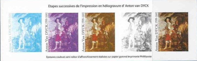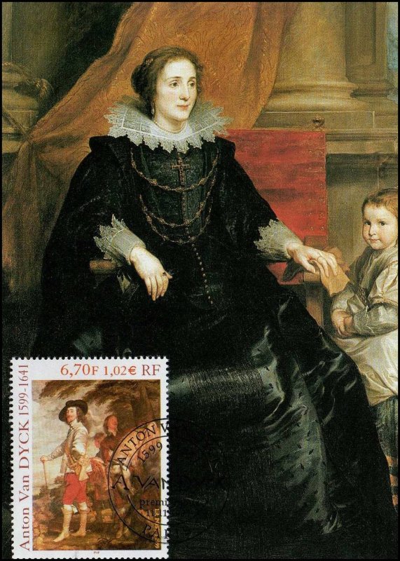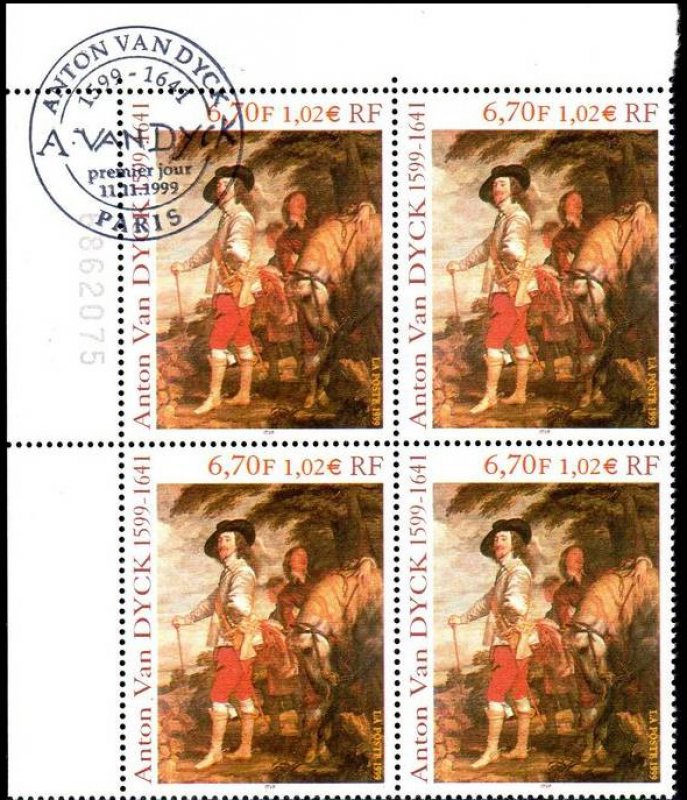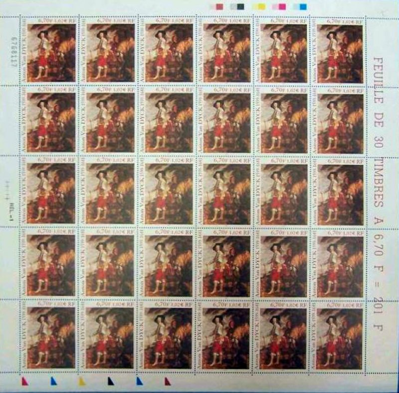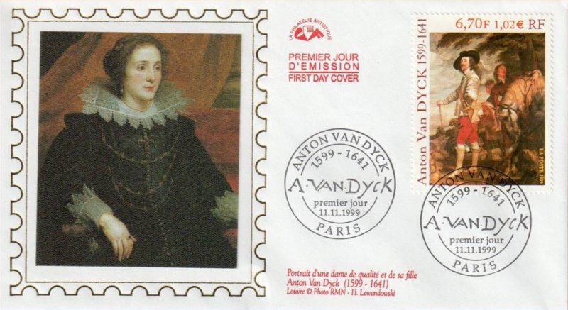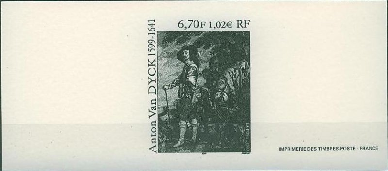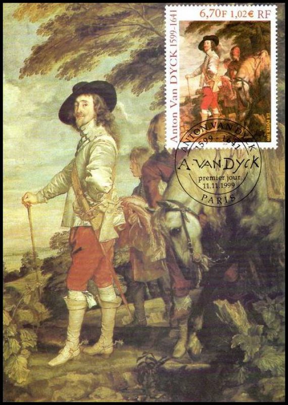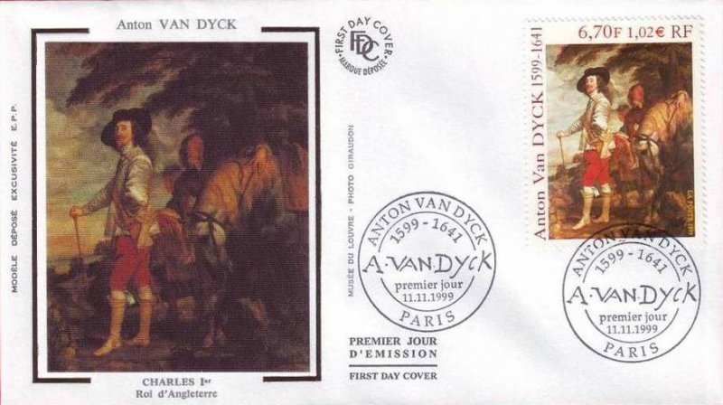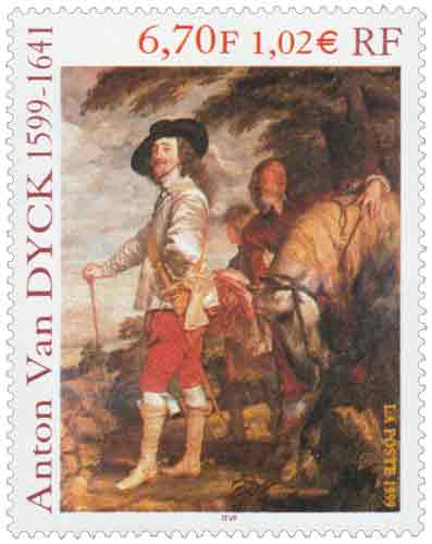 | Commentaire | Description synthétique du visuel du timbre : Anton van Dyck, né à Anvers, portraitiste, peintre et graveur, fut l’élève de Rubens dès l’âge de 13 ans. Il séjourna en Italie, où il peignit notamment l’une de ces œuvres les plus magistrales, le Portrait de Marie de Médicis. De retour à Anvers en 1624, il donna toute l’ampleur qui convient aux portraits des personnages de la haute société. Sa réputation vint jusqu’à Charles 1er d’Angleterre. Un détail de l’un de ses plus beaux portraits, Charles 1er, roi d’Angleterre, datant de 1635 et conservé au Louvre, illustre le timbre. Anton van Dyck y a mêlé avec brio couleurs brillantes, grises et tons dorés. Charles 1er y paraît dans toute son assurance royale, peint dans une composition hardie où le cheval, les serviteurs et le paysage, bien qu’ils occupent une bonne partie de l’espace, n’occultent pas la personnalité du souverain. Anton van Dyck a contribué à établir un lien entre la peinture flamande et l’italienne. Il a surtout joué un rôle déterminant dans l’établissement d’une école de peinture anglaise du XIIIe siècle, annonçant les Gainsborough, Reynolds et Lawrence. |