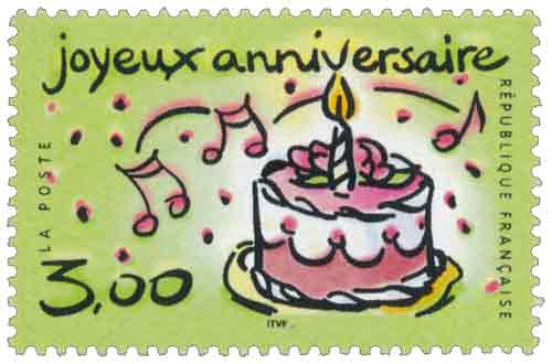| Commentaire | Description synthétique du visuel du timbre : Les timbres-poste semi-permanents du programme de l’année 1999 illustrent des thèmes, des événements et des circonstances du quotidien. Dans des couleurs gaies et attractives, un gâteau d’anniversaire illustre le visuel, l’esprit festif étant évoqué par la présence de notes de musique et de confettis Timbre sans millésime |