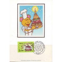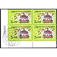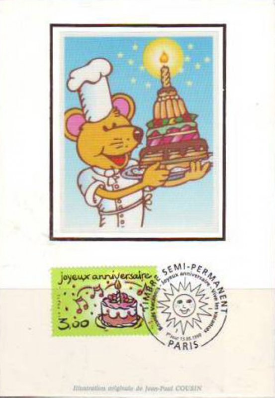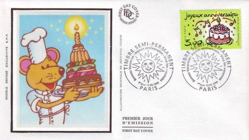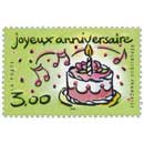 | Commentaire | Description synthétique du visuel du timbre : Les timbres-poste semi-permanents du programme de l’année 1999 illustrent des thèmes, des événements et des circonstances du quotidien. Dans des couleurs gaies et attractives, un gâteau d’anniversaire illustre le visuel, l’esprit festif étant évoqué par la présence de notes de musique et de confettis Timbre sans millésime |