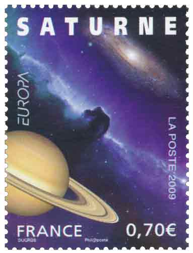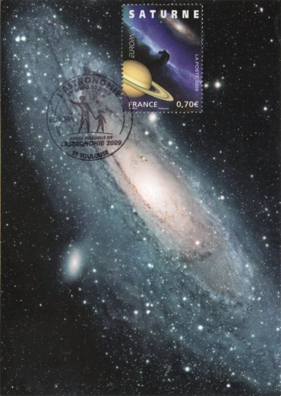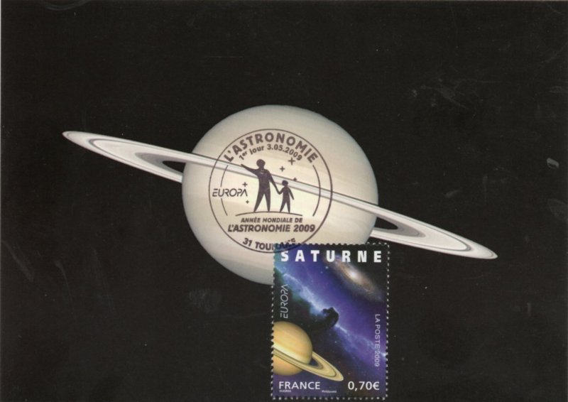 | Commentaire | La mise en vente anticipée a lieu le 3 mai au Parlement européen à Strasbourg et à la Cité de l'espace à Toulouse. Aurélie Baras dessine le timbre à date premier jour : un adulte et un enfant stylisés observent les étoiles dans le ciel. L’Unesco a déclaré 2009 année mondiale de l’astronomie. A cette occasion 104 pays organisent des actions pour mieux faire connaître l’astronomie et PostEurop a retenu l’Astronomie pour thème des timbres Europa 2009. Saturne et une exoplanète illustrent les 2 timbres, sur un fond stellaire, et pour évoquer toute l’histoire de l’astronomie, la lunette de Galilée, qui a marqué l’astronomie instrumentale, fait écho au télescope spatial COROT mis sur orbite en décembre 2006. Cette mission est la première expérience spatiale capable de découvrir des planètes extrasolaires telluriques et d'étudier des phénomènes et des objets jamais observés jusqu'à ce jour.. Certains détails du bloc seront recouverts d’une encre pailletée. |