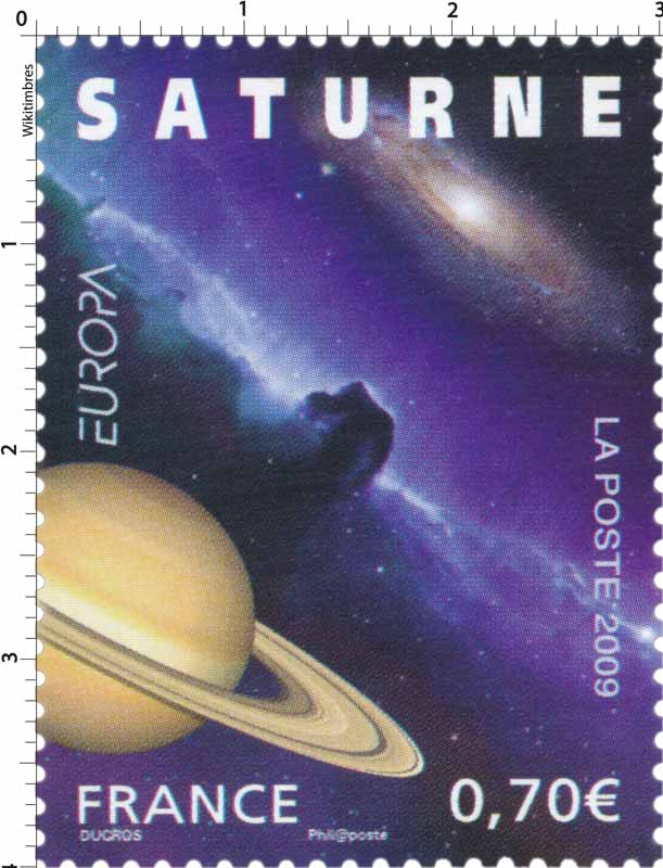 La mise en vente anticipée a lieu le 3 mai au Parlement européen à Strasbourg et à la Cité de l'espace à Toulouse. Aurélie Baras dessine le timbre à date premier jour : un adulte et un enfant stylisés observent les étoiles dans le ciel. L’Unesco a déclaré 2009 année mondiale de l’astronomie. A cette occasion 104 pays organisent des actions pour mieux faire connaître l’astronomie et PostEurop a retenu l’Astronomie pour thème des timbres Europa 2009. Saturne et une exoplanète illustrent