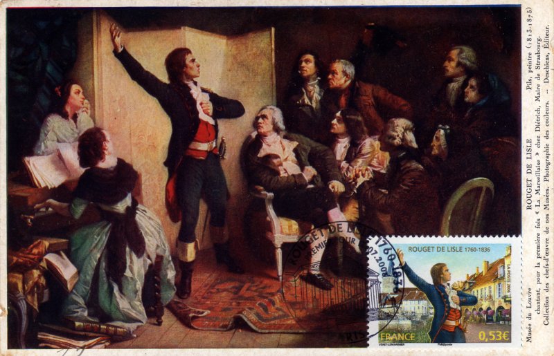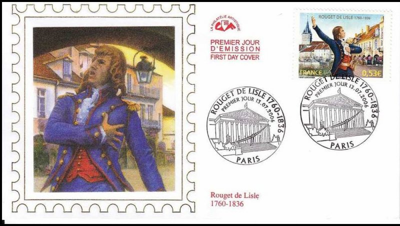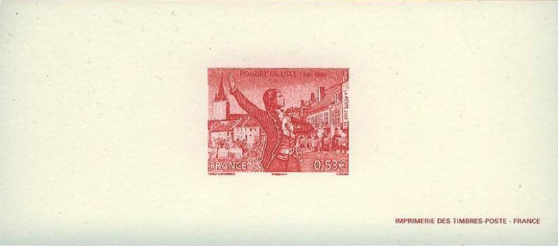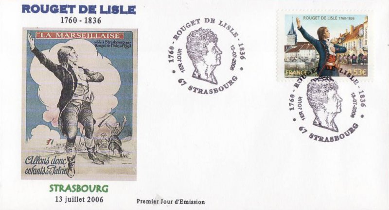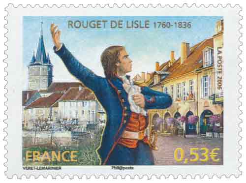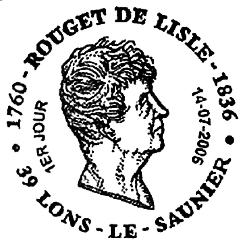 | Commentaire | Claude Joseph Rouget de Lisle est né le 10 mai 1760 à Lons-le-Saunier et est l’aîné de 8 enfants. Il se destine à la carrière des armes, sans grande motivation toutefois, plus enclin à écrire des vers qu’à accomplir ses tâches militaires. En 1791, il doit rejoindre l’armée du Rhin à Strasbourg, où il compose, la nuit du 24 avril 1792, le Chant de guerre pour l’Armée du Rhin qui deviendra la marche des Marseillois nommée ensuite La Marseillaise, l’hymne national. Bien qu’adhérant aux idées nouvelles, il reste attaché «à la Nation, à la Loi et au Roi » et est incarcéré durant la terreur. Suite à sa démission de l’armée et à cause de son caractère entier, de nombreuses portes se ferment. Il se fait même un ennemi de Bonaparte. Après une longue période de misère, il retrouve son honneur en 1830, sous le règne de Louis Philippe. Le visuel du timbre présente au premier plan le buste de Rouget de Lisle extrait du tableau de Pils, encadré d’une vue du village de Montaigu, où Rouget de Lisle vécut, et d’une vue de Lons-le-Saunier, où se trouve sa maison natale.. |