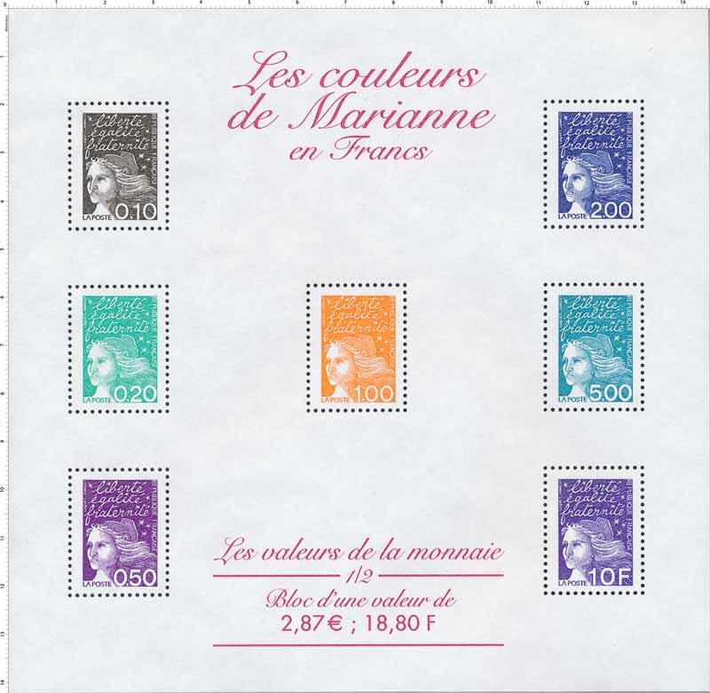 | Description | Les couleurs de Marianne en Francs. Les valeurs de la monnaie et les valeurs de la lettre. (Tous les timbres du bloc sont au type II et dentelés 13 x 13 1/4) |