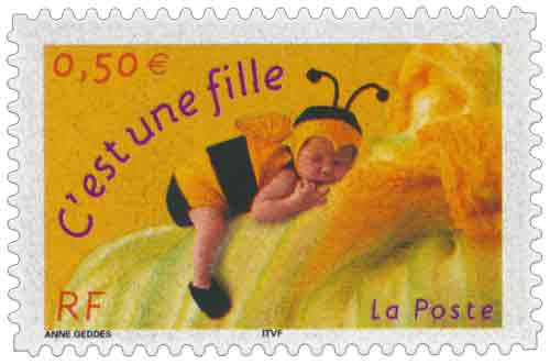 | Commentaire | Existe non surchargé accidentellement de bandes phosphorescentes. Émis en carnet, timbre auto-adhésif. Anne Geddes est une artiste photographe australienne. Elle met en scène des photos originales et élégantes de bébés, souvent des nouveaux nés, le plus jeune n’avait pas plus de deux jours. Son travail lui vaut désormais |