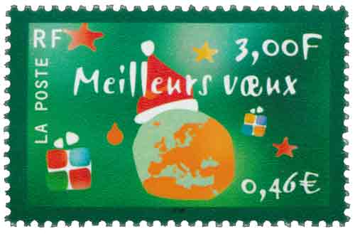 | Commentaire | Description synthétique du visuel du timbre : Un fond étoilé aux lumières irisées est animé par les symboles traditionnels de fin d’année : cadeau, boule. La Terre elle-même se coiffe d’un chapeau de Père Noël pour célébrer le nouvel an. Les codes couleurs également symbolisent les fêtes de fin d’année. Timbre sans millésime |