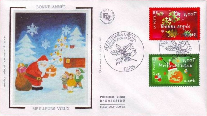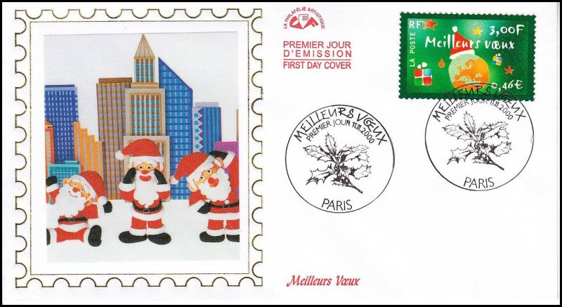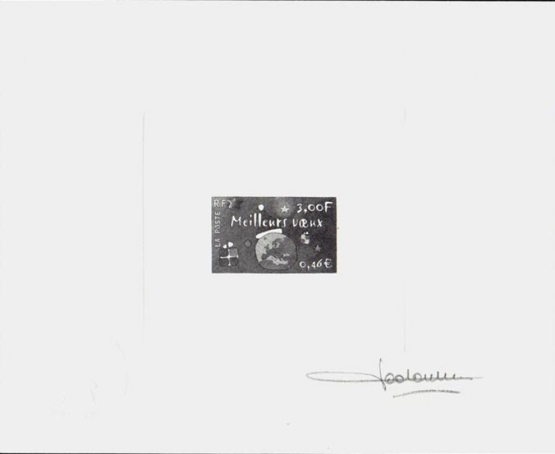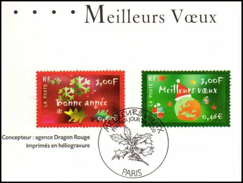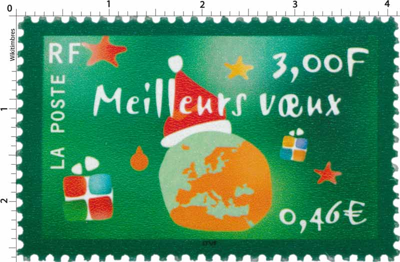 | Commentaire | Description synthétique du visuel du timbre : Un fond étoilé aux lumières irisées est animé par les symboles traditionnels de fin d’année : cadeau, boule. La Terre elle-même se coiffe d’un chapeau de Père Noël pour célébrer le nouvel an. Les codes couleurs également symbolisent les fêtes de fin d’année. Timbre sans millésime |