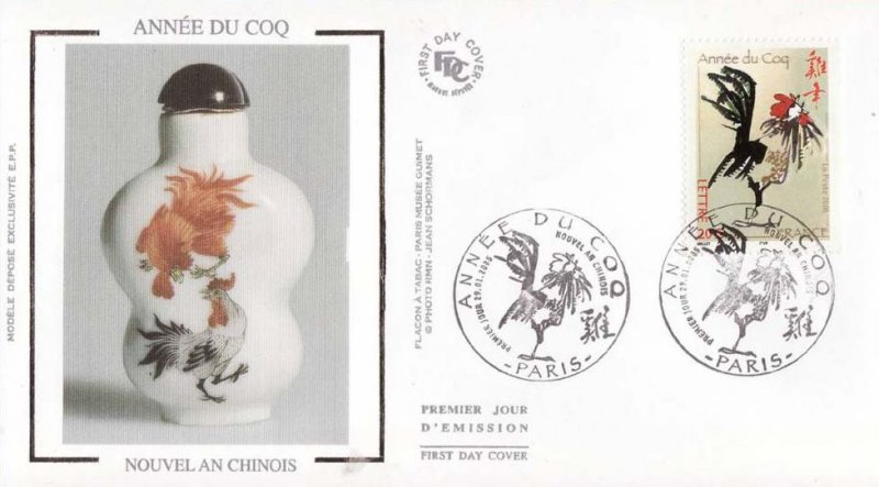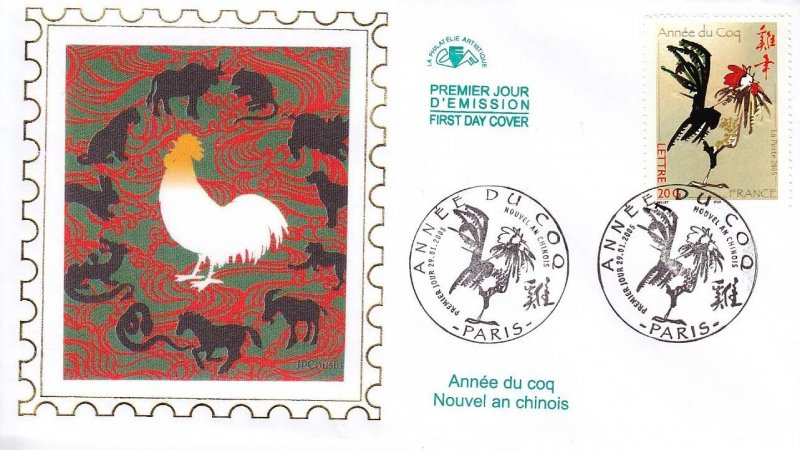 | Description | Nouvel An chinois : Année du coq. Premier timbre de l'émission annuelle sur le Nouvel An chinois. Provenant de la mini feuille de 10 TP |