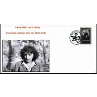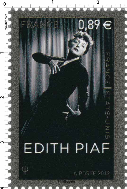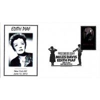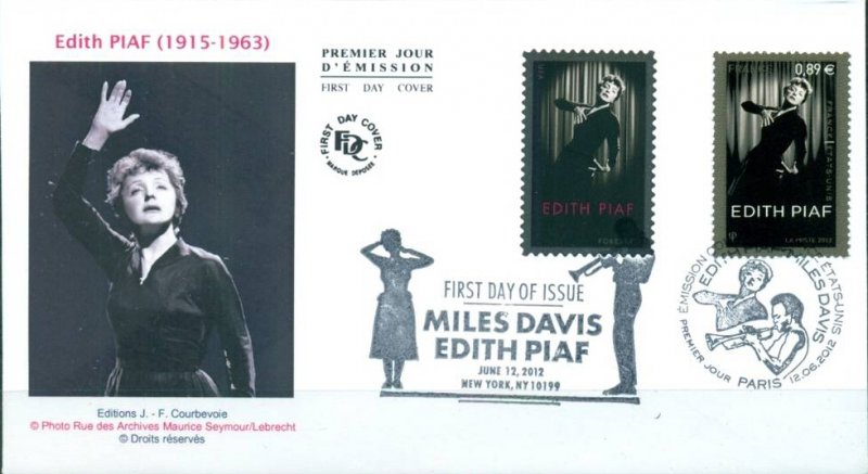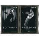 | Commentaire | Émis en feuilles de 13 ou 25 diptyques, timbre à date “Premier Jour” conçu par Valérie Besser. Émis lors du salon du timbre 2012 En 2012, l'émission commune avec les USA rend hommage à Édith Piaf et Miles Davis, 2 figures de renommée mondiale qui ont triomphé en France et aux États-Unis. Pour les Américains, Piaf est le symbole de la France et de Paris. Pour Miles Davis, la France fut une révélation, un pays qu'il trouva moins raciste que les États-Unis et où il eut la sensation “d'être traité comme un être humain”. Les diptyques indivisibles présentés en feuille de 25 sont positionnés en damier. Ils seront également émis en feuille indivisible de 13 diptyques. |