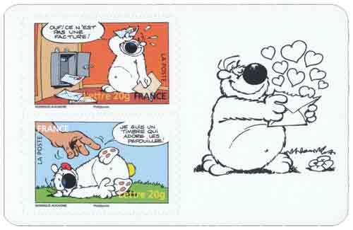 | Commentaire | Sourires L’objectif des carnets Sourires est de répondre aux attentes d’affranchissement du grand public et d’être diffusée le plus largement possible. Ces timbres doivent inciter le public à écrire. Ils sont émis en carnet de 10 timbres autocollants. Malgré une longue absence due à la disparition inopinée de son créateur – Dupa - Cubitus est resté très cher au cœur des bédéphiles de 7 à 77 ans. Le revoici adopté par deux nouveaux maîtres, mais tout à fait égal à lui-même… Le scénariste Pierre Aucaigne et le dessinateur Michel Rodrigue nous offrent en timbres les mésaventures burlesques et humoristiques de cette «énooorme» et affectueuse boule de poils blancs, de son brave maître Sémaphore et de son meilleur ennemi, le chat Sénéchal. |