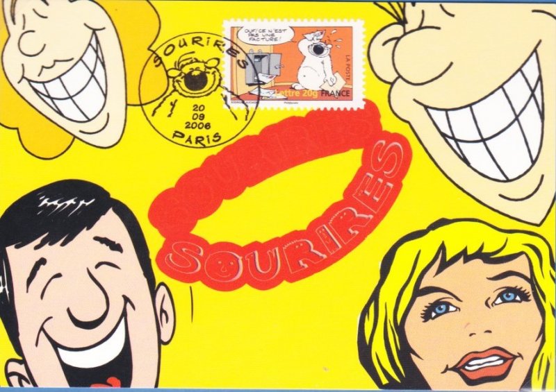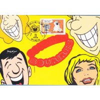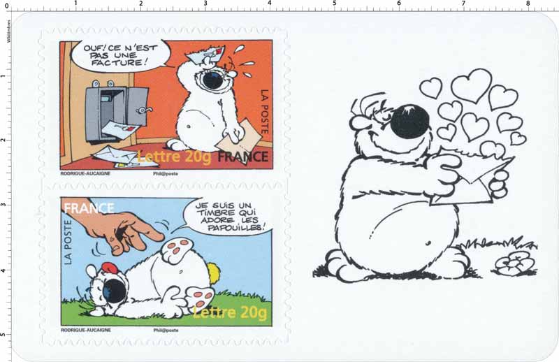 | Commentaire | Sourires L’objectif des carnets Sourires est de répondre aux attentes d’affranchissement du grand public et d’être diffusée le plus largement possible. Ces timbres doivent inciter le public à écrire. Ils sont émis en carnet de 10 timbres autocollants. Malgré une longue absence due à la disparition inopinée de son créateur – Dupa - Cubitus est resté très cher au cœur des bédéphiles de 7 à 77 ans. Le revoici adopté par deux nouveaux maîtres, mais tout à fait égal à lui-même… Le scénariste Pierre Aucaigne et le dessinateur Michel Rodrigue nous offrent en timbres les mésaventures burlesques et humoristiques de cette «énooorme» et affectueuse boule de poils blancs, de son brave maître Sémaphore et de son meilleur ennemi, le chat Sénéchal. |