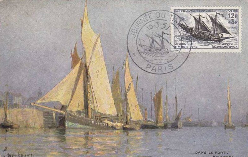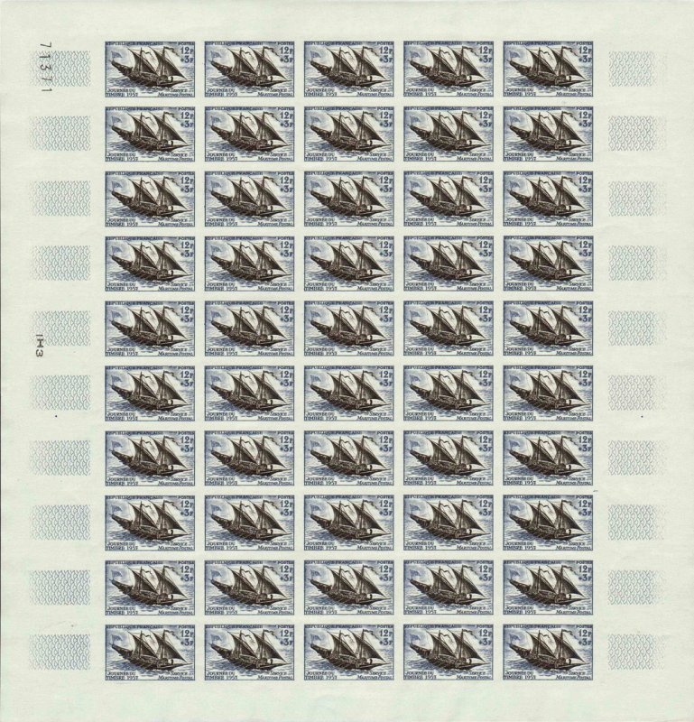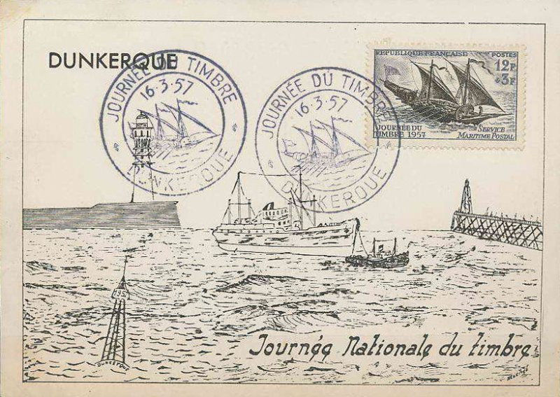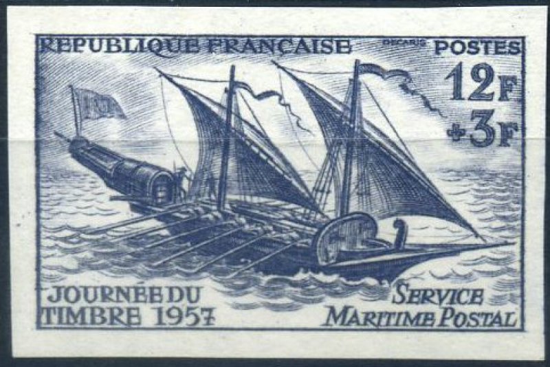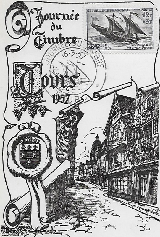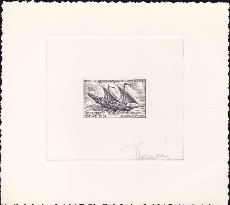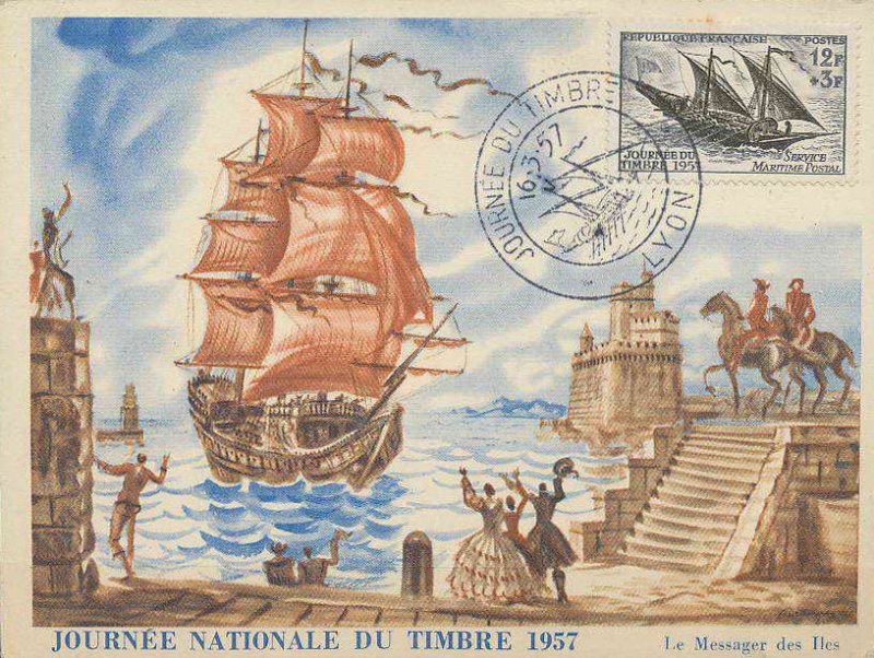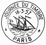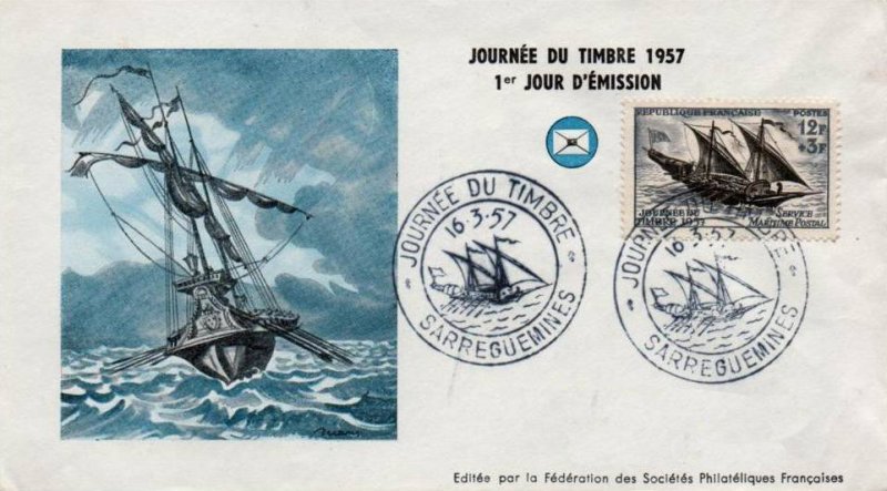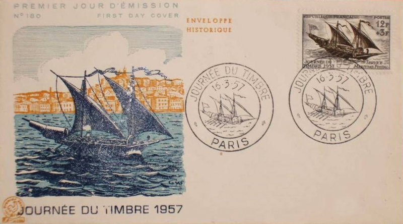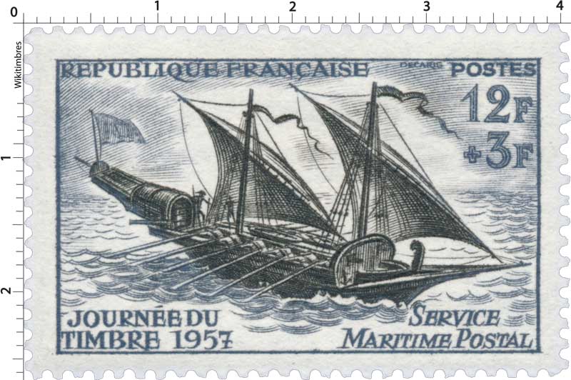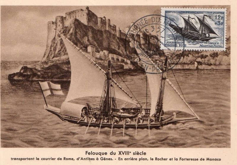 | Description | Journée du timbre 1957. Service Maritime Postal. Felouque du 18e siècle |