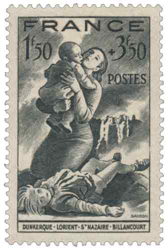 | Commentaire | Villes bombardées - Dunkerque - Lorient - Saint-Nazaire - Billancourt. Démonétisé le :01/11/1944 Ce timbre gommé français de 1943, intitulé Villes bombardées, associe dans une même composition Dunkerque, Lorient, Saint-Nazaire et Billancourt, quatre sites durement touchés par les bombardements alliés durant la Seconde Guerre mondiale. Dessiné et gravé par Pierre Gandon, ce timbre relève clairement de la philatélie de propagande du régime de Vichy, utilisant l’émotion suscitée par les destructions urbaines pour alimenter le discours officiel et justifier l’appel à la solidarité nationale. L’iconographie, volontairement sombre, adopte une dominante noire et un format vertical qui accentuent la gravité du message. L’ajout d’une surtaxe au profit du Secours National inscrit ce timbre dans la logique des émissions dites semi-postales, fréquentes entre 1940 et 1944, où l’affranchissement postal est indissociable d’un prélèvement présenté comme humanitaire. Le choix de villes stratégiques – ports militaires majeurs pour Dunkerque, Lorient et Saint-Nazaire, et centre industriel emblématique pour Billancourt – renforce la portée symbolique de l’émission et explique son importance dans les collections consacrées aux timbres de guerre de 1943. Du point de vue philatélique, ce timbre est recherché autant pour son contexte historique précis que pour la qualité de sa taille-douce rotative, typique du savoir-faire français de l’époque. Sa démonétisation au 1er novembre 1944 marque la rupture nette entre les émissions du régime de Vichy et la restauration postale de la France libérée, ce qui en fait un repère chronologique clair dans les collections spécialisées. |
