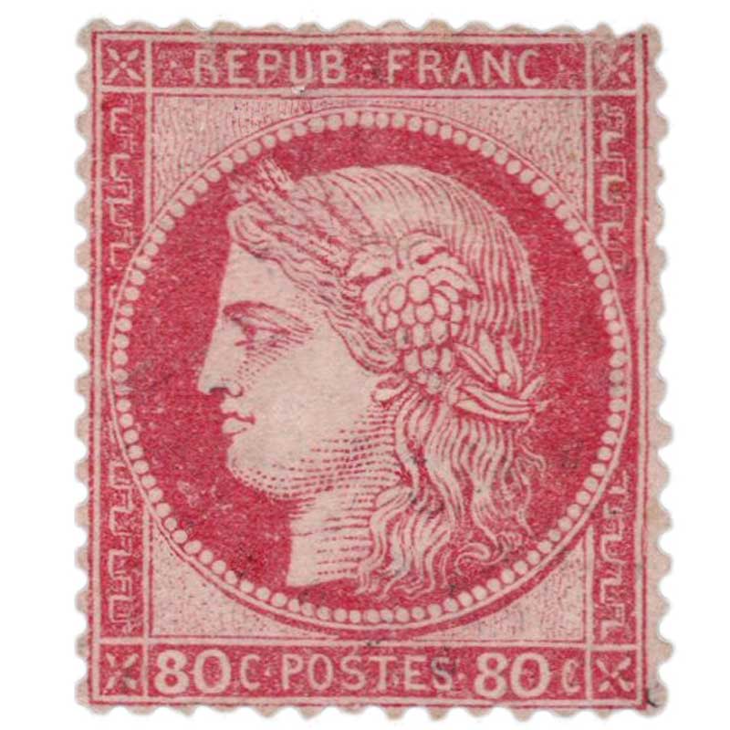 Le 80 centimes rose, n°57, paraît en septembre 1872, en même temps que le 30c brun (YT n°56). Cette forte valeur faciale répond aux besoins d’affranchissement élevés, en particulier pour les correspondances à destination de l’étranger ou pour les envois lourds. Imprimé jusqu’en 1875, il est retiré par décret du 5 juillet 1875, marquant la fin de sa courte période de circulation.
