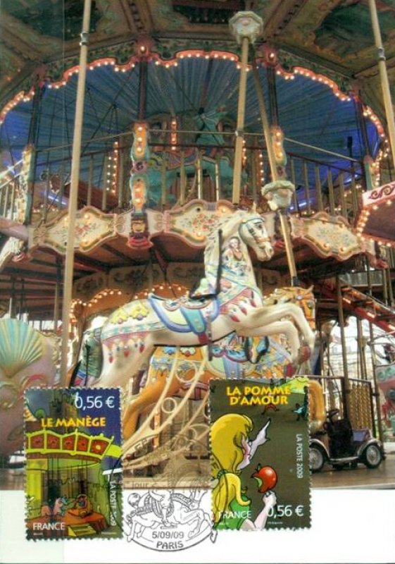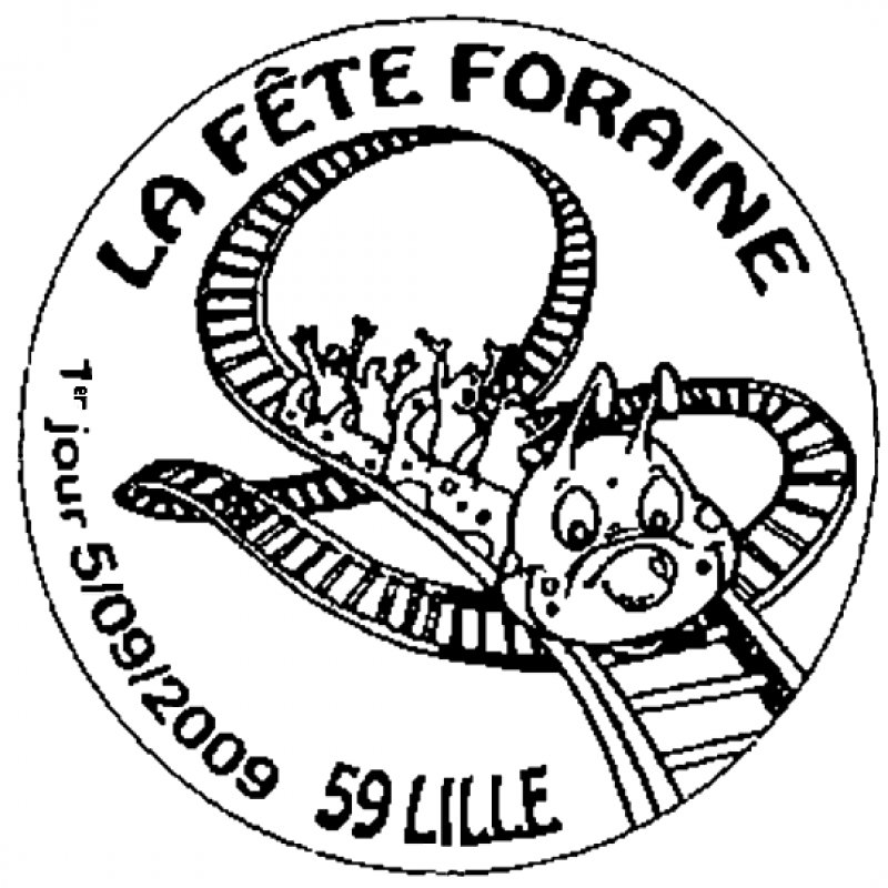 | Commentaire | La manifestation premier jour a lieu les 5 et 6 septembre à la foire aux manèges de Lille et le 5 septembre au Jardin d'acclimatation de Paris. Millet crée deux timbres à date spéciaux qui reprend le train « chenille » des montagnes russes du timbre pour Lille. À Paris, le sujet est une jeune fille chevauchant un cheval de manège |