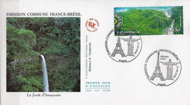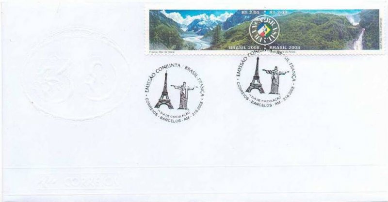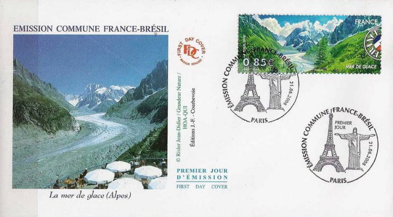 | Commentaire | Paysage de France et du Brésil. La mer de Glace, vallée de Chamonix. La mise en vente anticipée a lieu les 21 et 22 juin au Salon du timbre, à Paris. Le timbre à date « premier jour » est dessiné par Claude Perchat qui place côte à côte la tour Eiffel et le Christ Rédempteur de Rio de Janeiro. En 2009, le timbre est élu « plus beau timbre de l'année » dans la catégorie « timbre en offset ou en héliogravure » suite à un vote des internautes, organisé par Phil@poste |