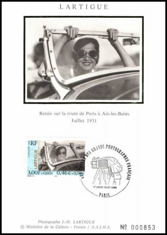 | Commentaire | Description synthétique du visuel du timbre : Jacques Lartigue (1894, 1986) prend ses premières photographies avec l’aide et l’appareil de son père. Il découvre instinctivement cet appareil et tient un journal des petits évènements de sa vie. Il élabore ainsi jusqu’à sa mort une biographie réfléchie, par nature quelque peu fictive, consignée en images dans de volumineux albums. La photographie “ Route de Paris, Aix les Bains, Renée ” qui illustre le timbre, témoigne de l’aspect de ses photographies saisies au vif, instants heureux de sa vie et de ses amours. Ces personnages de la haute bourgeoisie saisis par Lartigue soulignent l’aspect sociologique de son œuvre. Les reflets du fond du visuel évoquent subtilement, dans des tons bleus, le bain des tirages photographiques. |