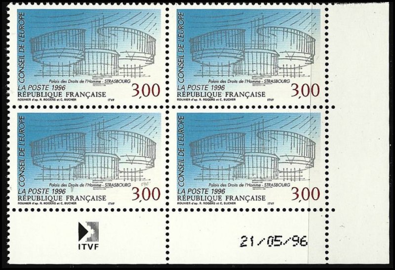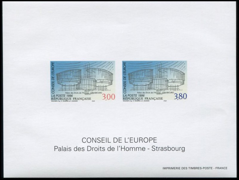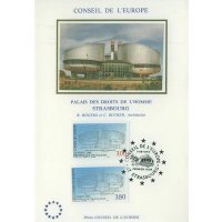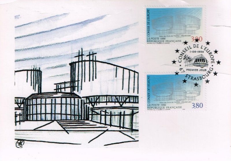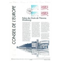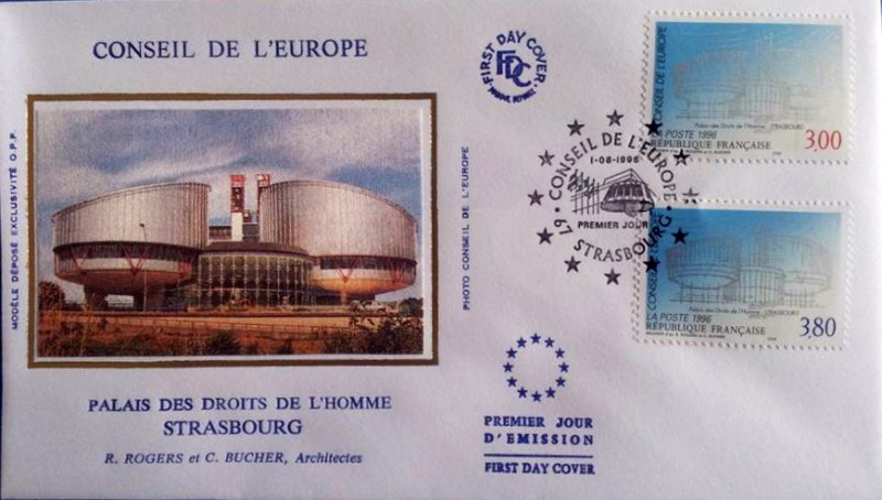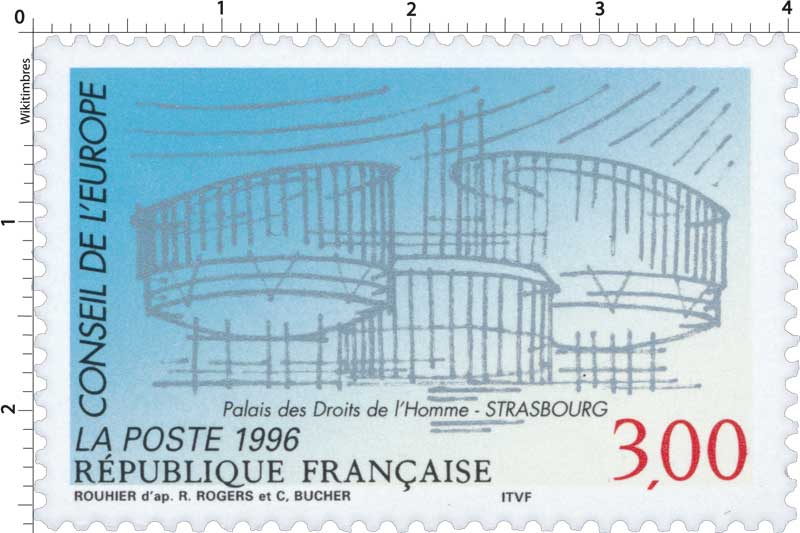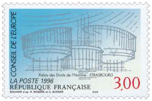 | Commentaire | Visuel : le Palais de la Cour Européenne des Droits de l'Homme à Strasbourg a été conçu par l’architecte britannique Richard Rogers, a été inauguré en 1995. La façade du bâtiment doit évoquer "la balance de la justice" et par sa conception, l’architecte a cherché à "réaliser un bâtiment aux lignes résolument contemporaines et symboliques qui associent le droit au principe de transparence". |