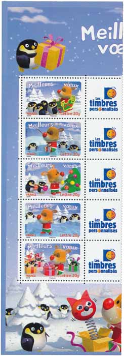 | Commentaire | Meilleurs vœux mini feuille composée de 10 timbres (5 timbres-poste en 2 ex.) Meilleurs vœux avec vignette attenante personnalisable imprimée sur papier autocollant. Timbre sans millésime |