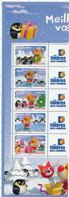 | Commentaire | Meilleurs vœux mini feuille composée de 10 timbres (5 timbres-poste en 2 ex.) Meilleurs vœux avec vignette attenante personnalisable imprimée sur papier autocollant. Timbre sans millésime |