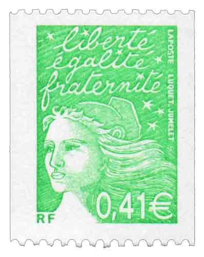 | Commentaire | Pour la numérotation au verso voir documentation. Description synthétique du visuel du timbre : En janvier 2002, 15 nouvelles Marianne du 14 juillet seront émises en simple affichage euro. Le TVP, sans affichage de la valeur, est émis plus tôt (août 2001). La nouvelle série émise correspond aux : 8 pièces en euro : 0,01 € - 0,02 € - 0,05 € - 0,10 € - 0,20 € - 0,50 € - 1,00 € - 2,00 € 1er, 2e et 3e échelon de poids de la lettre zone 1, service prioritaire : TVP / 0,69 € (= 4,50 F) / 1,02 € (= 6,70 F) 1er, 2e et 3e échelon de poids de la lettre zone 1, service écopli : 0,41 € (= 2,70 F) / 0,53 € (= 3,50 F) / 0,64 € (= 4,20 F) 1er échelon de la zone 2 et 4, service prioritaire : 0,58 € (= 3,80 F) / 0,67 € (= 4,40 F) |