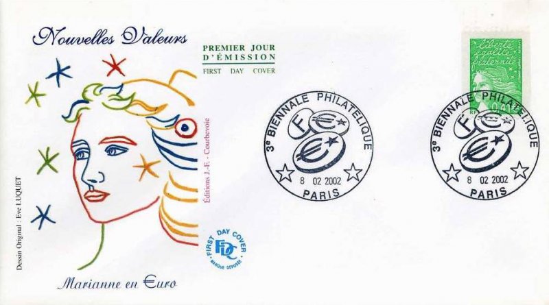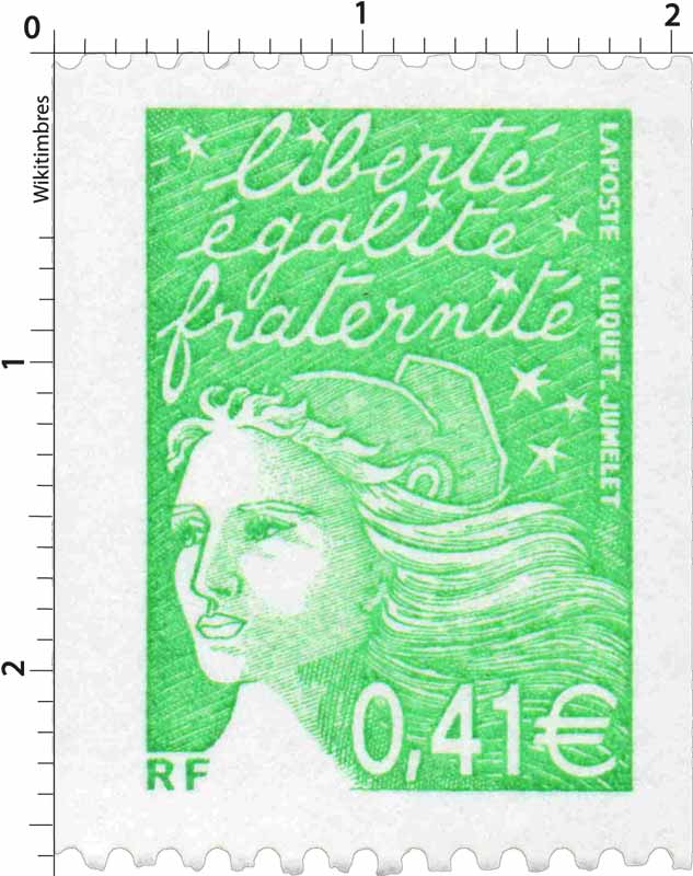 | Commentaire | Pour la numérotation au verso voir documentation. Description synthétique du visuel du timbre : En janvier 2002, 15 nouvelles Marianne du 14 juillet seront émises en simple affichage euro. Le TVP, sans affichage de la valeur, est émis plus tôt (août 2001). La nouvelle série émise correspond aux : 8 pièces en euro : 0,01 € - 0,02 € - 0,05 € - 0,10 € - 0,20 € - 0,50 € - 1,00 € - 2,00 € 1er, 2e et 3e échelon de poids de la lettre zone 1, service prioritaire : TVP / 0,69 € (= 4,50 F) / 1,02 € (= 6,70 F) 1er, 2e et 3e échelon de poids de la lettre zone 1, service écopli : 0,41 € (= 2,70 F) / 0,53 € (= 3,50 F) / 0,64 € (= 4,20 F) 1er échelon de la zone 2 et 4, service prioritaire : 0,58 € (= 3,80 F) / 0,67 € (= 4,40 F) |