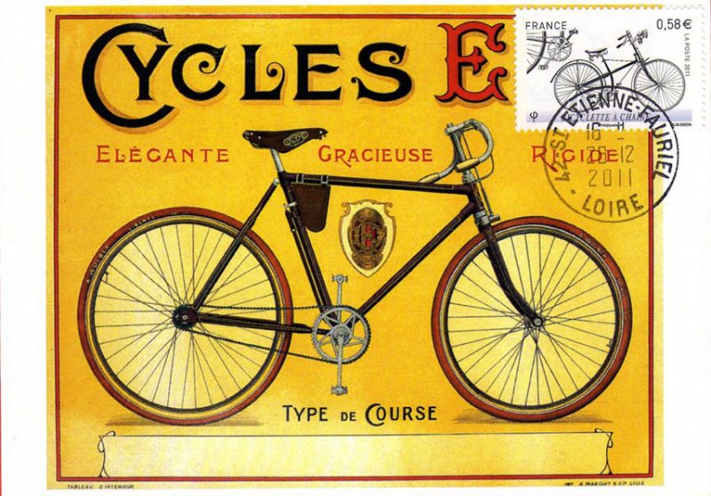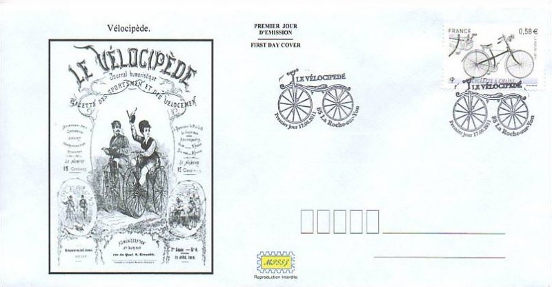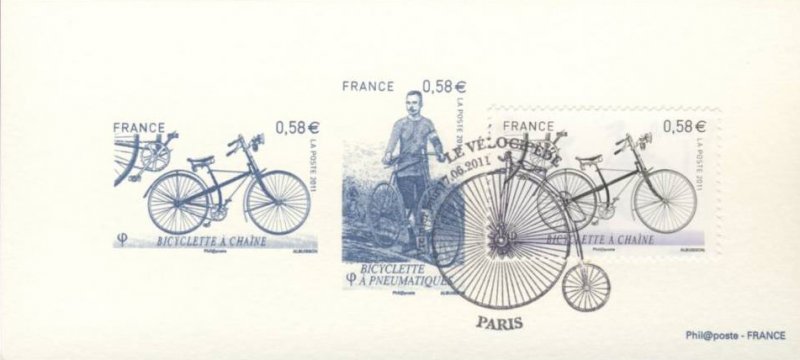 | Commentaire | Les six timbres du bloc Coin des collectionneurs 2011 retracent Les différentes étapes de L'histoire de La bicyclette, de La draisienne au vélo. La draisienne, commercialisée en France en 1817 sous Le nom de vélocipède, n'avait ni pédale ni guidon. Il faut attendre 1861 pour que Pierre Michaux invente La pédivelle et crée une entreprise de fabrication de vélocipèdes à pédales. Ils sont ensuite perfectionnés en Angleterre où apparaissent en 1872 Le grand bi et sa roue géante puis, en 1885, Les mécanismes de transmission par chaîne du pédalier à La roue et Les engrenages qui permettent de gagner en vitesse tout en réduisant La taille de La roue. Dans Les années qui suivent, Les courses et Les exploits se multiplient, comme Le premier Paris Brest- Paris remporté par Charles Terront après 71 heures d'effort. Aujourd'hui, Le vélo de ville, moyen de transport alternatif à faible empreinte écologique, connait un nouvel essor |