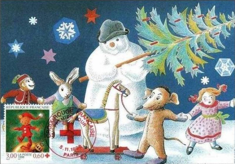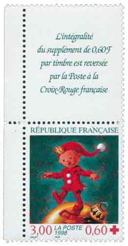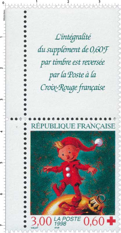 | Description | Au profit de la Croix-Rouge française. Fêtes de fin d'année, représentation d'un lutin vêtu de rouge marchant sur une boule de Noël |