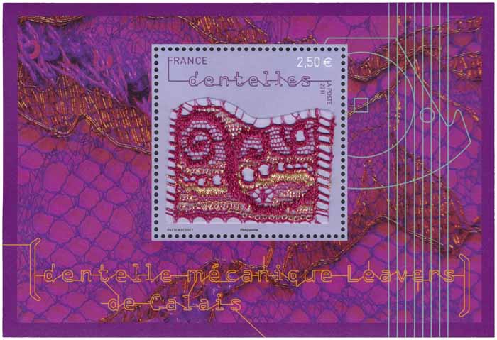 | Commentaire | Selon son Lieu d'origine, La dentelle est réalisée au fuseau, à L'aiguille ou encore au métier mécanique et ses motifs varient à L'infini. Ces blocs illustrent Les spécificités de quatre des grandes régions dentellières de France: Alençon, Chantilly, Le Puy-en-Velay et Calais La dentelle de Calais est une dentelle mécanique s'inspirant des dentelles main d'Alençon ou de Chantilly. Cette industrie provient de L'adaptation d'un système Jacquard sur un métier à tulle importé d'Angleterre |