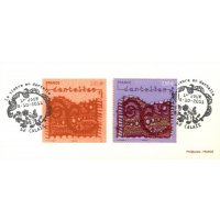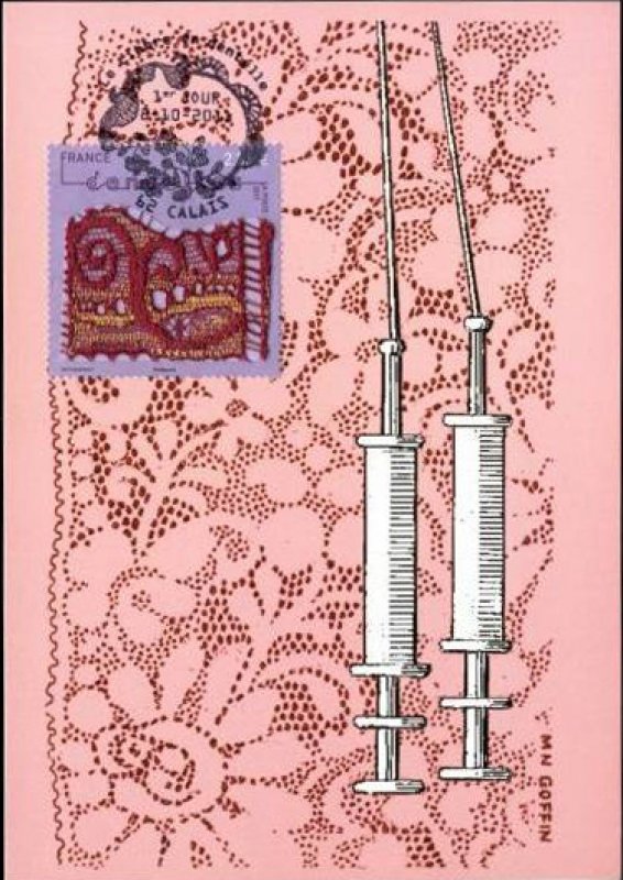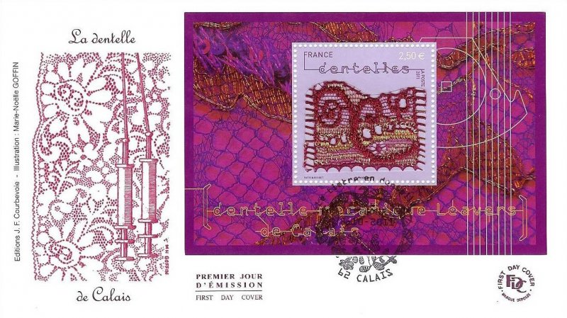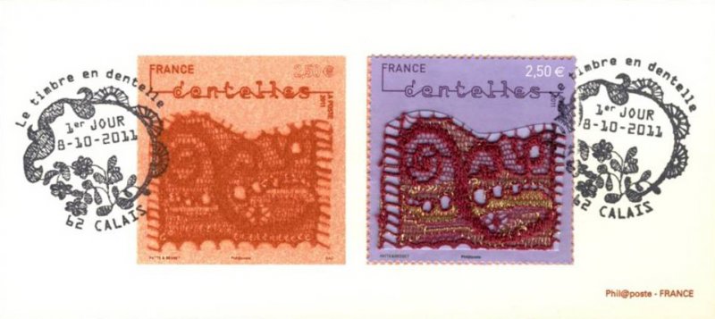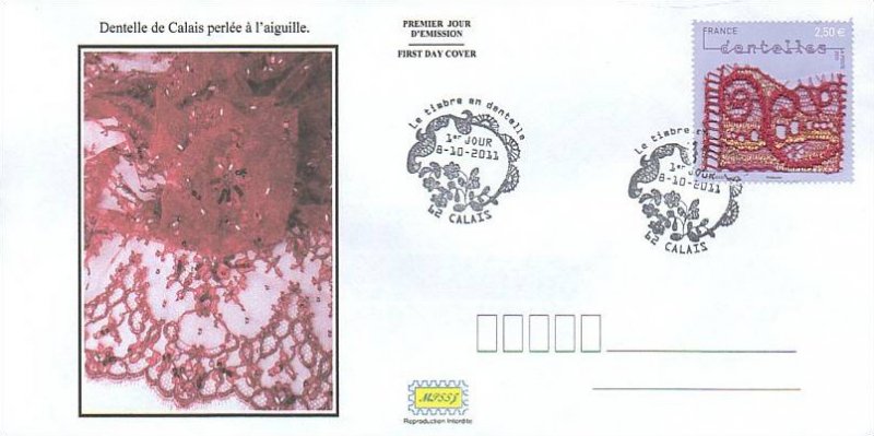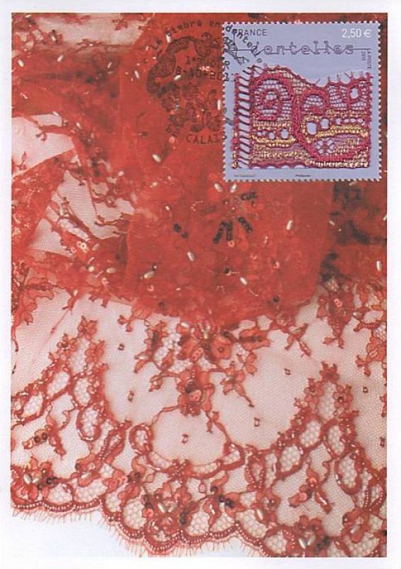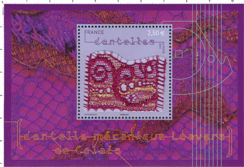 | Commentaire | Selon son Lieu d'origine, La dentelle est réalisée au fuseau, à L'aiguille ou encore au métier mécanique et ses motifs varient à L'infini. Ces blocs illustrent Les spécificités de quatre des grandes régions dentellières de France: Alençon, Chantilly, Le Puy-en-Velay et Calais La dentelle de Calais est une dentelle mécanique s'inspirant des dentelles main d'Alençon ou de Chantilly. Cette industrie provient de L'adaptation d'un système Jacquard sur un métier à tulle importé d'Angleterre |