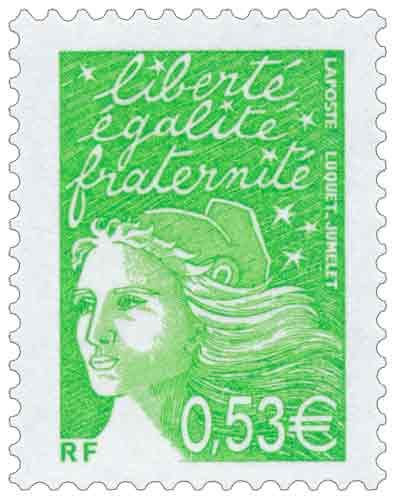 | Commentaire | Description synthétique du visuel du timbre : En janvier 2002, 15 nouvelles Marianne du 14 juillet seront émises en simple affichage euro. Le TVP, sans affichage de la valeur, est émis plus tôt (août 2001). La nouvelle série émise correspond aux : 8 pièces en euro : 0,01 € - 0,02 € - 0,05 € - 0,10 € - 0,20 € - 0,50 € - 1,00 € - 2,00 € 1er, 2e et 3e échelon de poids de la lettre zone 1, service prioritaire : TVP / 0,69 € (= 4,50 F) / 1,02 € (= 6,70 F) 1er, 2e et 3e échelon de poids de la lettre zone 1, service écopli : 0,41 € (= 2,70 F) / 0,53 € (= 3,50 F) / 0,64 € (= 4,20 F) 1er échelon de la zone 2 et 4, service prioritaire : 0,58 € (= 3,80 F) / 0,67 € (= 4,40 F). Les timbres imprimés en 2001 en feuilles monobloc portent dans la marge supérieure la mention : Timbres en euros mis en vente à partir du 1er janvier 2002 . |