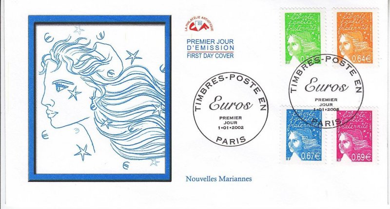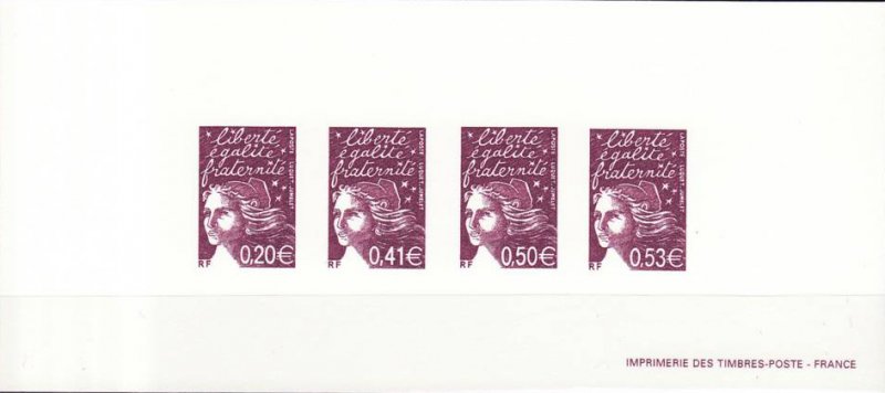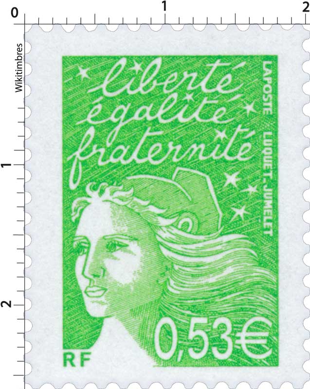 | Commentaire | Description synthétique du visuel du timbre : En janvier 2002, 15 nouvelles Marianne du 14 juillet seront émises en simple affichage euro. Le TVP, sans affichage de la valeur, est émis plus tôt (août 2001). La nouvelle série émise correspond aux : 8 pièces en euro : 0,01 € - 0,02 € - 0,05 € - 0,10 € - 0,20 € - 0,50 € - 1,00 € - 2,00 € 1er, 2e et 3e échelon de poids de la lettre zone 1, service prioritaire : TVP / 0,69 € (= 4,50 F) / 1,02 € (= 6,70 F) 1er, 2e et 3e échelon de poids de la lettre zone 1, service écopli : 0,41 € (= 2,70 F) / 0,53 € (= 3,50 F) / 0,64 € (= 4,20 F) 1er échelon de la zone 2 et 4, service prioritaire : 0,58 € (= 3,80 F) / 0,67 € (= 4,40 F). Les timbres imprimés en 2001 en feuilles monobloc portent dans la marge supérieure la mention : Timbres en euros mis en vente à partir du 1er janvier 2002 . |