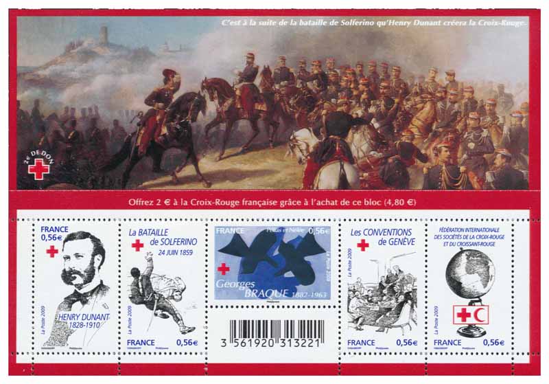 | Commentaire | Visuel : l'œuvre d'Ange-Louis Janet ("Janet-Lange",1815-1872, lithographe, peintre) : Napoléon III et sa maison militaire, à la bataille de Solférino, 24 juin 1859 (Italie, Lombardie) Le Mouvement Croix-Rouge/Croissant-Rouge, et singulièrement la Croix-Rouge française, célèbrent 150 ans de lutte contre toutes les formes de précarité et accentuent leur mobilisation face aux défis humanitaires de notre siècle. C’est en juin 1859, sur le champ de bataille de Solferino, en Italie, que l’idée de ce qui allait devenir la Croix-Rouge est venue à Henry Dunant. Cet idéal s’est traduit par la rédaction des Conventions de Genève, pierre angulaire du droit international humanitaire. 150 ans plus tard, l’emblème universel de la Croix-Rouge est porteur d’un message de paix et d’humanité, que traduit poétiquement le timbre avec la Colombe de Georges Braque. Aujourd’hui, le Mouvement international de la Croix-Rouge et du Croissant-Rouge est devenu la plus importante organisation humanitaire au monde et regroupe près de 100 millions d’hommes et de femmes. La petite Croix-Rouge sera gaufrée. Ce timbre est grevé d'une surtaxe au profit de la Croix Rouge française |
