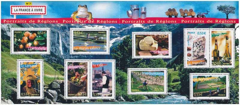 | Commentaire | Portraits de Régions LA FRANCE À VIVRE N°7 La série philatélique Portraits de régions a été inaugurée en 2003. Elle célèbre la France, ses coutumes locales, ses traditions populaires, sa gastronomie, son architecture...Le septième bloc rend hommage aux diverses régions de France à travers la gastronomie, l’artisanat et les coutumes locales : la mirabelle, le café, le beurre, le roquefort, l’huile d’olive, le carnaval, les marais salants, les vendanges, la transhumance, les hortillonnages. |