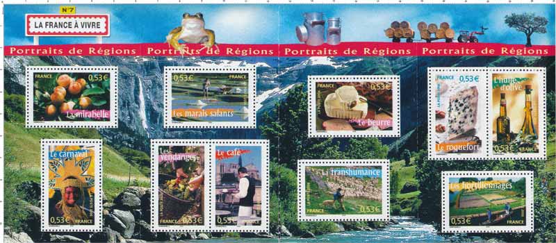 | Commentaire | Portraits de Régions LA FRANCE À VIVRE N°7 La série philatélique Portraits de régions a été inaugurée en 2003. Elle célèbre la France, ses coutumes locales, ses traditions populaires, sa gastronomie, son architecture...Le septième bloc rend hommage aux diverses régions de France à travers la gastronomie, l’artisanat et les coutumes locales : la mirabelle, le café, le beurre, le roquefort, l’huile d’olive, le carnaval, les marais salants, les vendanges, la transhumance, les hortillonnages. |