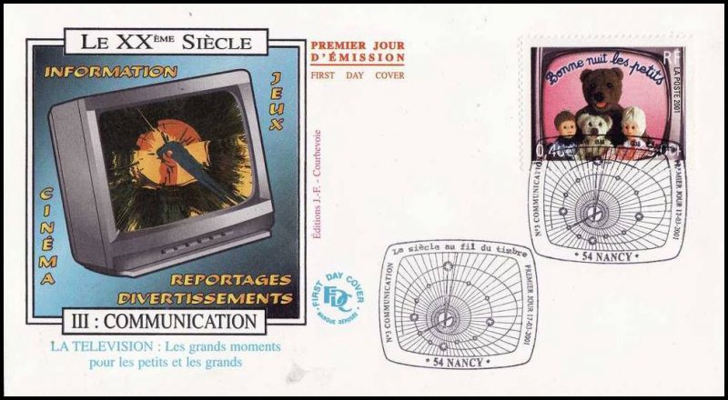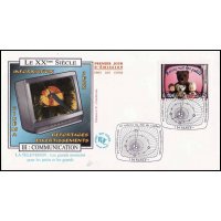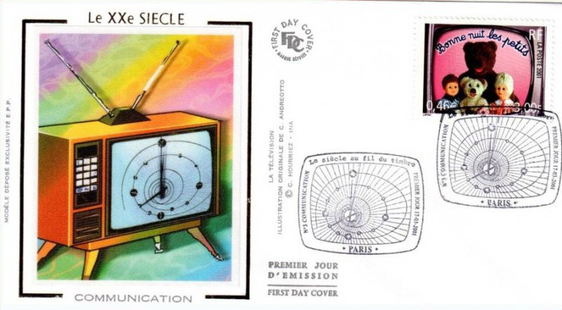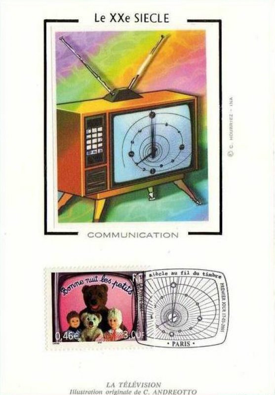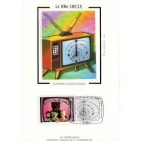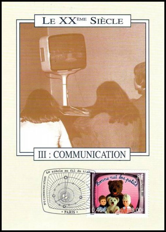 | Commentaire | Description synthétique du visuel du produit : Ce produit est le troisième bloc de la collection Le siècle au fil du timbre. Comme pour les blocs précédents, les thèmes des timbres ont été choisis à la suite d’une consultation auprès des Français. Les cinq sujets plébiscités par le public pour ce troisième bloc commémorant les évènements ayant marqué le siècle en matière de communication sont : Bonne nuit les petits (les incontournables de la télévision), Le disque compact (les supports de diffusion), le petit mineur (les publicités qui ont fait date), Salut les copains (les grandes heures de la radio), Le téléphone portable (les outils personnels de communication). Sont mis en scène sur le fond : un disque vinyle, Casimir, des enfants regardant la télévision, un groupe musical, l’arobase et une adresse internet pour illustrer le web, un kiosque à journaux en hommage à la presse écrite. Pour conserver la logique de collection, le format, le cachet d’oblitération et la typographie du titre ont été conservés. Afin de renouveler l’intérêt des amateurs de timbres, l’esprit en est plus contemporain, les couleurs plus modernes et chaudes. |