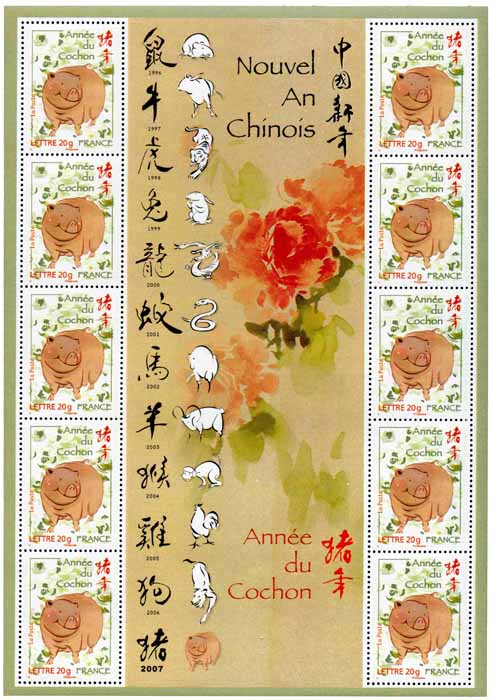 | Commentaire | De l’année du rat à l’année du cochon, le système astrologique oriental comprend douze signes animaux. Le cycle du zodiaque chinois se renouvelle ainsi tous les douze ans, le signe du cochon étant le dernier. Timbre sans millésime |