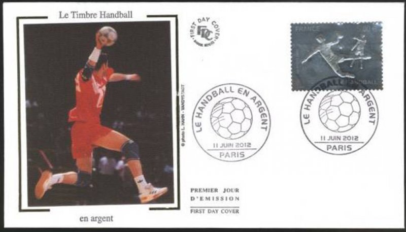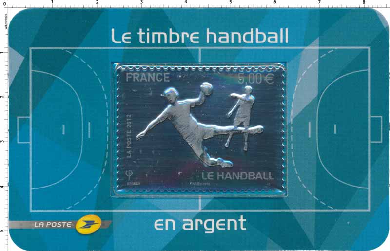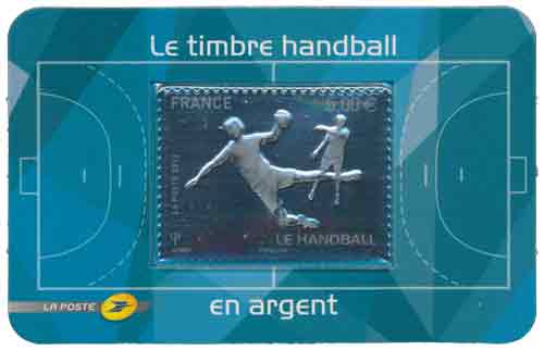 | Commentaire | Timbre en argent, autocollant sous blister. Timbre à date illustré conçu par Aurélie Baras. Émis lors du salon du timbre 2012. Après le football en 2010 et le rugby l’an dernier, La Poste complète sa série de timbres “Sports collectifs”. Après le « Rugby » en 2011, La Poste complète sa série de timbres « sport en argent » en émettant un timbre handball le 11 juin. Ce timbre - argent 999 millièmes - est un emboutissage d’une feuille d’argent par une matrice gravée. |