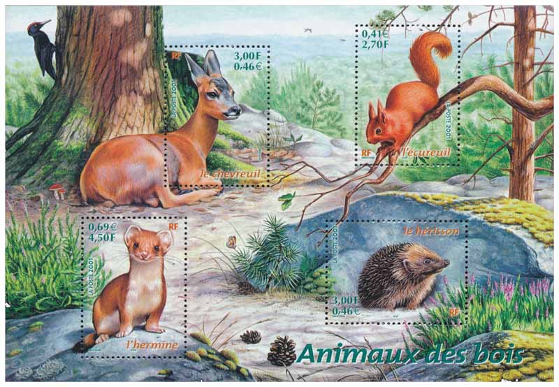 | Commentaire | Description synthétique du visuel du timbre : Les 4 animaux retenus sont mis en scène dans un sous-bois dans une ambiance à la fois colorée et douce, baignée d’une lumière tamisée. Des éléments divers, caractéristiques de cet environnement, animent la fresque : bruyère, champignons, mousse, pommes de pin.. mais aussi pic-vert, papillon … Sont mis en scène : un chevreuil (femelle), grand mammifère sauvage, un écureuil, rongeur adapté à l’existence dans les arbres, une hermine, petit animal, aux oreilles rondes et dressées et le hérisson, mammifère recouvert de piquants. |