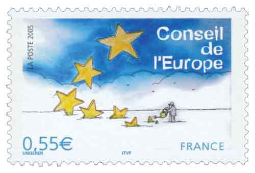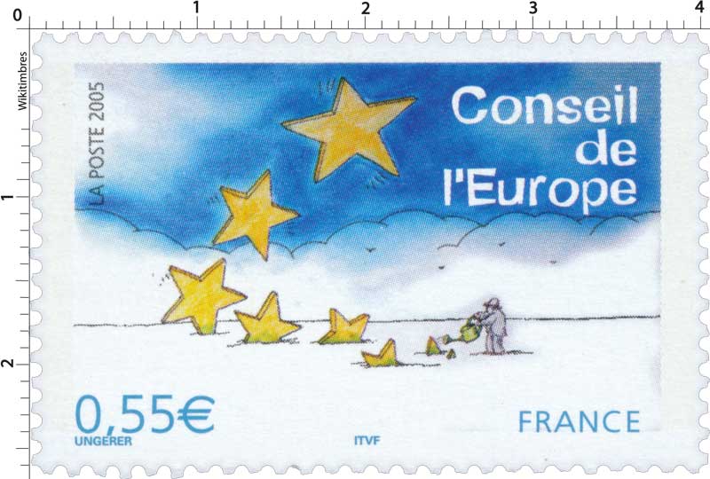 | Commentaire | Conseil de l’Europe Le français Tomi Ungerer porte le flambeau de la démocratie, de la liberté et des droits universels de l’homme. Ambassadeur de Bonne Volonté auprès du Conseil de l’Europe pour l’enfance et l’éducation depuis 1999, il s’est engagé dans les nombreux combats de cette Organisation. Fervent défenseur de l’idée européenne, Tomi Ungerer a créé le dessin qui a servi de motif à ce timbre pour symboliser le rôle patient et fondamental du Conseil de l’Europe dans la construction européenne, tel le jardinier qui veille, avec amour, jour après jour, à la croissance de ce qu’il a semé. C’est pourquoi il a appelé ce dessin «Conseil de l’Europe, semeur d’espoirs ». |