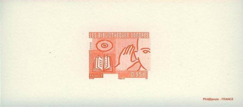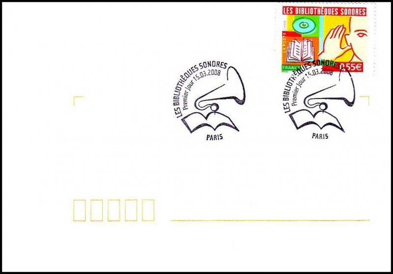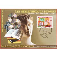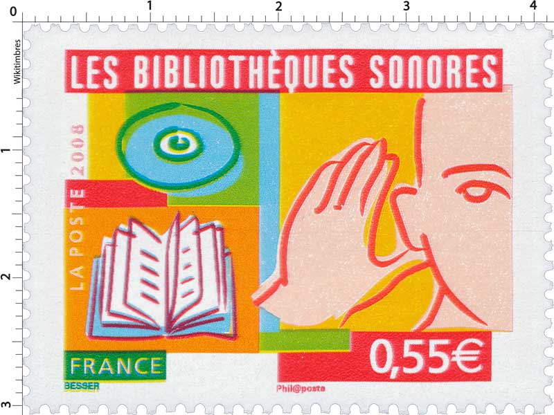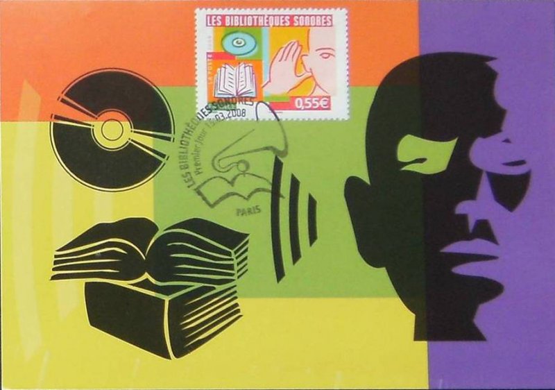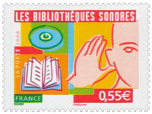 | Commentaire | La manifestation premier jour a lieu le 15 avril à Paris et les 15 et 16 avril à Bourg-en-Bresse, Cholet, Lille, Périgueux et Strasbourg. Le timbre à date premier jour, également de Valérie Besser, représente les éléments d'un gramophone, dont la tête de lecture posée sur un livre ouvert. Le 20 octobre 2008, ce timbre reçoit le « prix citron » du timbre le moins apprécié du jury du Grand prix de l'art philatélique Les bibliothèques sonores ont été créées en 1972 à l’initiative de l'Association des Donneurs de Voix afin de rompre l'isolement des personnes atteintes de troubles visuels. Ces bibliothèques sont environ 120 dans toute la France à proposer gratuitement aux personnes aveugles ou malvoyantes des « audio livres », des livres enregistrés sur cassettes ou CD par des bénévoles « donneurs de voix ». L'ensemble des bibliothèques sonores effectue, avec l’accord des auteurs et éditeurs, plus de 300.000 prêts par an de tous genres, romans policiers ou historiques, œuvres classiques, livres pour la jeunesse mais aussi témoignages, conférences ou entretiens. Le visuel met en lumière ce lien particulier entre le livre, le son et l’audio lecteur. |