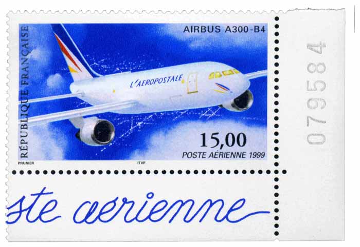 | Commentaire | Description synthétique du visuel du timbre : Faisant suite au Bréguet XIV (programme 1997) et au Potez 25 (programme 1998) qui rendaient hommage à l’époque héroïque de l’aviation postale, l’Airbus A300 - B4 ici représenté symbolise la modernité et le dynamisme actuel et futur de l’Aéropostale. La scène, clin d’œil au transport du courrier de nuit par l’Aéropostale, se déroule dans une atmosphère nocturne et suggère les pistes d’atterrissage éclairées de points lumineux. Ce timbre a également été émis en feuille de 40 TP, il est alors dentelé 13 x 12demi |